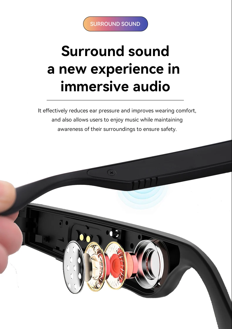 OPEN SOLUTION: This solution not only allows you to listen to music, take phone calls and hear notifications from your glasses, but also listen to the world around you.